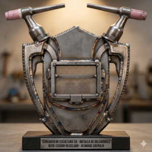 Descripción del concurso:Demostrar la maestría en el proceso GTAW (TIG) y la creatividad artística, replicando el escudo oficial del evento utilizando únicamente materiales reciclados de acero al carbono.